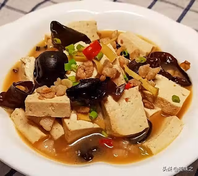 豆腐1塊、五花肉1小塊、泡發木耳適量、蔥適量、姜適量、蒜適量、小米辣1個、醬油1小勺、鹽適量、糖1g、水澱粉適量。