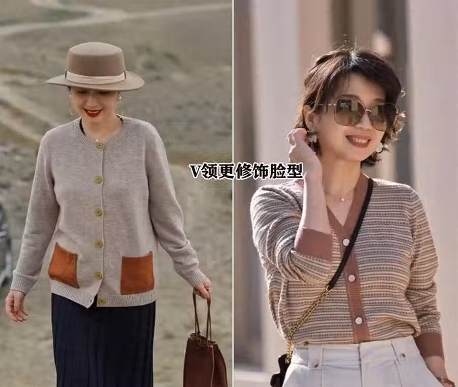 奶奶衫的款式比較經典,領口選擇更不能馬虎。有圓領,翻領,方領或V領。但要從拔高脖頸線條來看,我還是最推薦大家選擇V領。可以修飾肩頸,對於臉大,臉方、臉圓還可以修飾臉型,顯得臉更小。