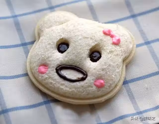 4、蓋上另一片土司,並用口袋模具使勁向下壓,就會得到一個立體的小熊頭部,去掉多餘的邊。