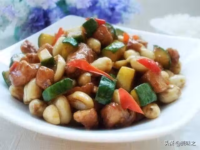 7、放入黃瓜翻炒片刻,最後放入花生米合炒,放入味精拌均勻即可。