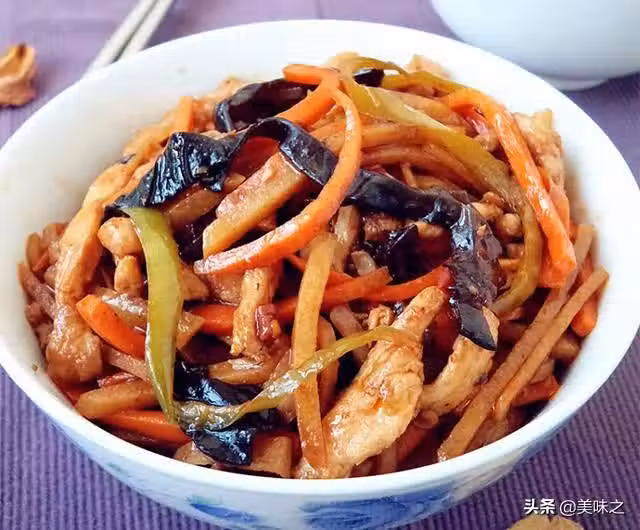 2、 青椒、 胡蘿蔔、 黑木耳洗乾淨切成絲。