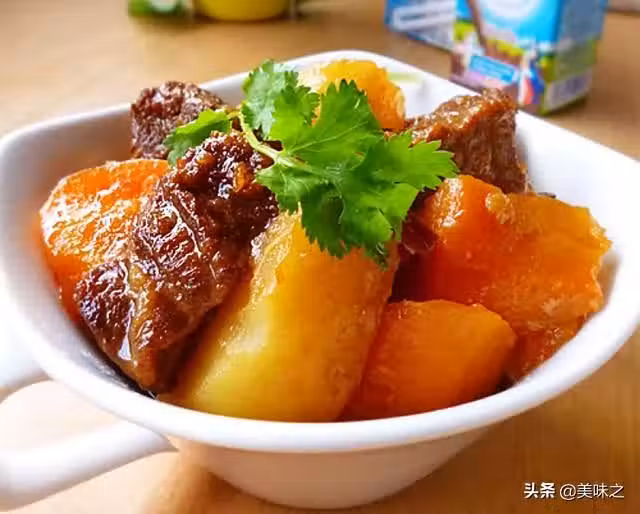 7、牛腩悶到酥軟後再放入土豆和胡蘿蔔塊。