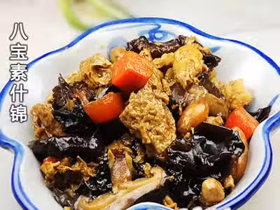 材料:香菇 50 克,木耳 50 克,腐竹 50 克,脆皮豆腐 100 克,花生米 50克,蓮藕 100 克,胡蘿蔔 100 克, 蔥薑 100 克