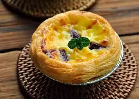 食材:雞蛋黃2個、低筋麵粉7g、紫薯1個、冷凍蛋撻皮6個、淡奶油75g、牛奶70g、淡奶7g、綿白糖30g。