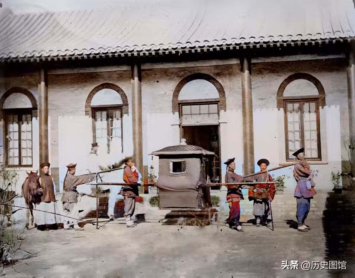 北京城內,一名官員準備出行的瞬間,幾名轎班人員正抬著轎子在門前等候。有四名轎夫抬轎,可以肯定,這是一名四到六品官員,乘四人抬的藍呢轎。照片拍攝於1885年。