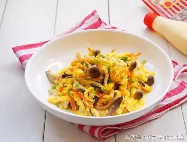 【材料】鮮香菇20克,蟹味菇30克,草菇20克,平蘑20克, 黑木耳10克,洋蔥半個,胡蘿蔔1根,雞蛋3個,蔥花適量,鹽適量