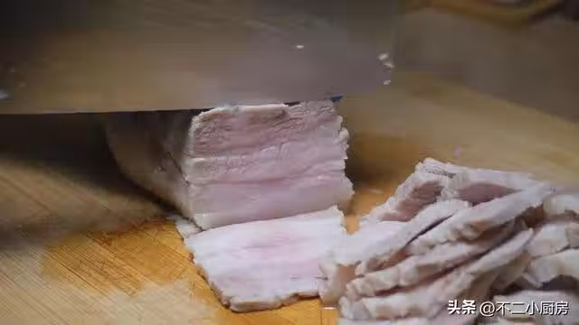 3、這個時候五花肉也煮的差不多了,用筷子插一下,輕輕能插透就可以了,然後撈出來晾涼給它切成薄薄的厚片,這裡的片一定要切的薄一點,切的薄一點,這樣才更容易入味,切好之後裝入到碗中方便下一步操作。