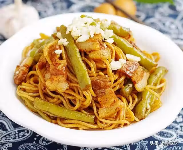 扁豆500g、細切面270g、蔥30g、姜5g、蒜20g、鹽2g、紅燒醬油25g、八角一個、葵花籽油25g、清水450ml。