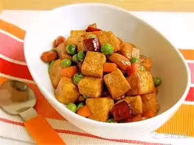 4)炒鍋下油燒熱,下豆腐丁炸至金黃瀝油撈出。