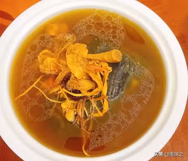 烏雞1塊、姬松茸20g、蟲草花15g、黃芪10g、紅棗15g、枸杞10g、鹽少許。