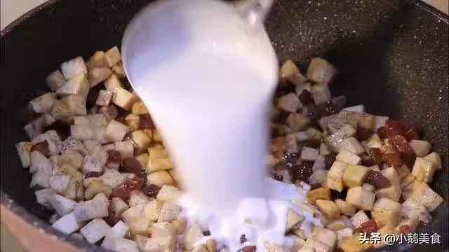4、關火後立刻加入2勺米粉水,快速翻均勻。這樣炒一點熟漿,蒸的芋頭糕,芋頭臘腸粒不會沉澱到盤底,上下分布均勻會更好吃。