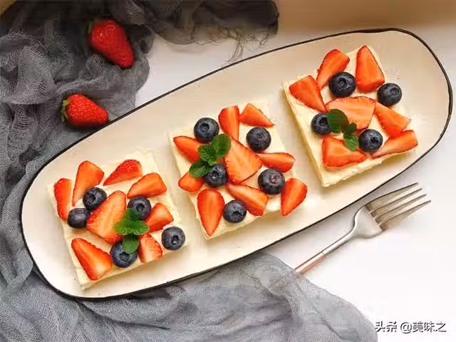 吐司3片、淡奶油200g、糖15g、小草莓6-8個、藍莓少許適量。