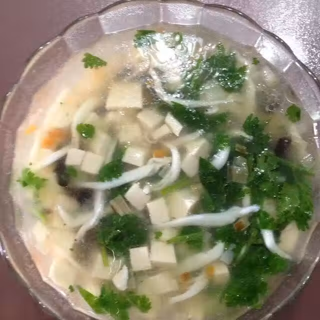 加入開水,再將胡蘿蔔丁,木耳碎放進鍋隨豆腐一起煮3分鐘左右,加鹽,雞精,白鬍椒,之後放入銀魚,煮大概1—2分鐘就可以了