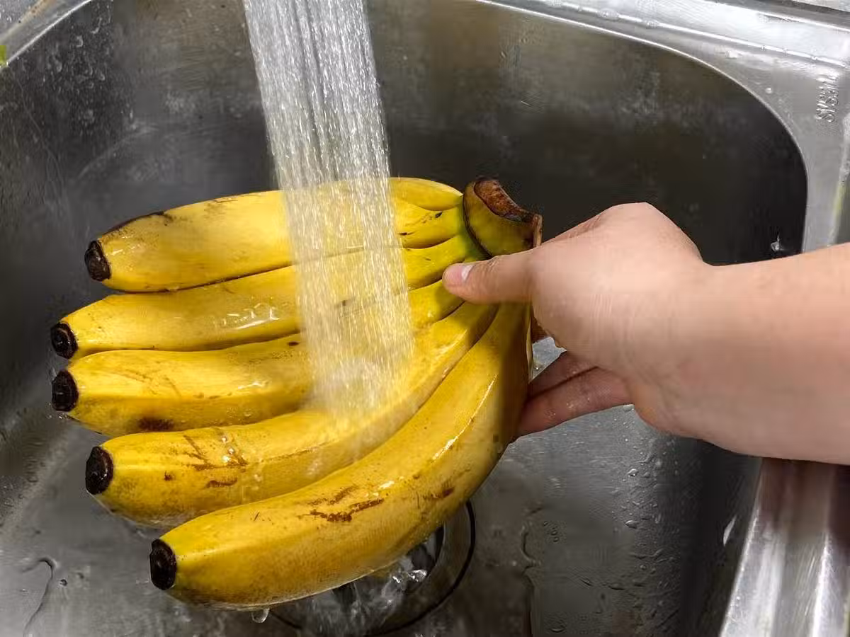 3、香蕉沖洗乾淨之後,我們再用廚房紙巾把香蕉表面上的水分給擦乾,這一步一定不能少哦,因為如果香蕉表面含有水分的話,那麼也很容易變黑其小斑點。