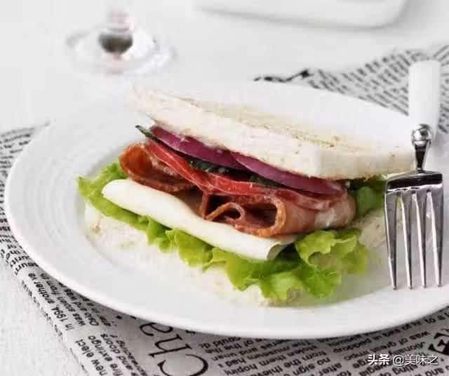 吐司麵包2片、西紅柿3片、培根2片、生菜2片、洋蔥2圈、沙拉醬適量、奶酪1片、黃瓜3片。