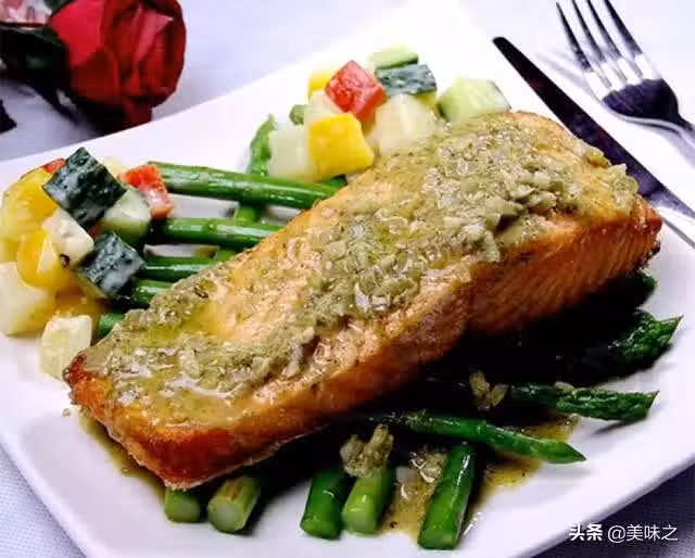 11、把炒熟的蘆筍交叉擺放在餐盤裡,把三文魚擺放在蘆筍上。
