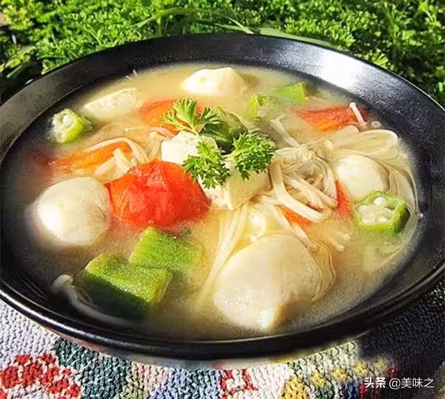 1、金針菇切去尾部洗乾淨;秋葵去頭去尾切小段;番茄切小塊。