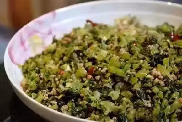 配料:袋裝雪菜、肉末、蔥、生抽、鹽、干辣椒