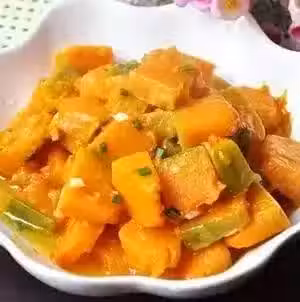 4.鹽分炒勻後,加入清水適量燜一會兒至南瓜軟爛, 裝盤的時候撒上蔥花即可