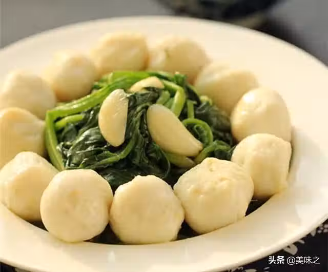 魚丸200克、菠菜1把、薑片3片、油適量、蒜片3瓣、鹽適量。