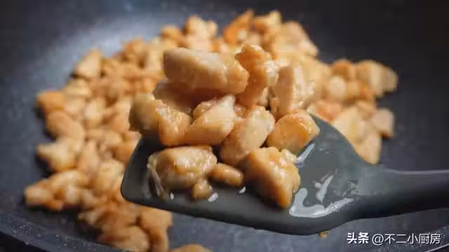 5、起鍋燒油,油溫4成熱,把腌制好的雞胸肉給它下進去,快速的翻炒一下,不要讓它們粘連在一起,這裡的火不要調的太大,保持中火就可以。這個過程大約需要3~5分鐘,一直翻炒到雞胸肉,顏色微微發焦,像這個樣子就可以了。