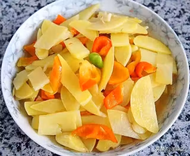 土豆、青椒、油、鹽、五香粉、蒜、醋、糖、生抽。