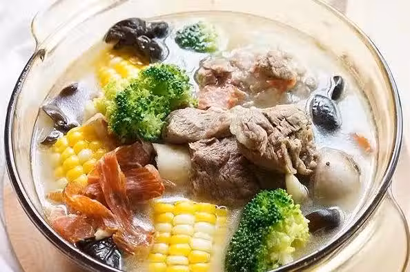 食材:大棒骨2根 甜玉米1個 火腿片幾片 西蘭花幾棵 黑木耳少許 鹽3勺 糖少許