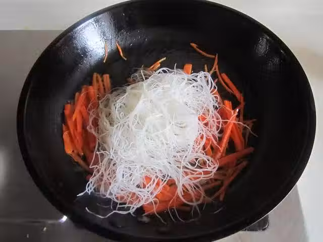 3. 煸炒至微微發軟的時候加入泡軟的米粉進去翻炒;