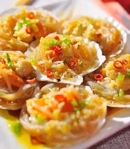 配料:扇貝6,粉絲50g,海鮮醬1茶匙,大蒜50g,鹽2g,料酒3ml,蔥15g,油10ml,老醬油,紅椒適量。