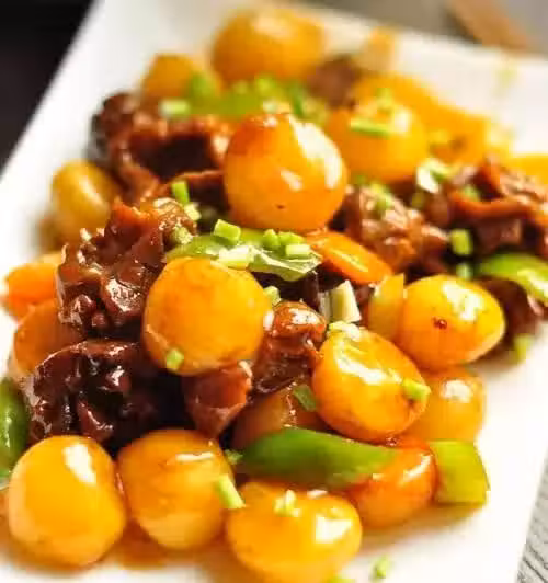 配料:雞肉200克,土豆球200克,適量的油,鹽適量,胡椒適量,蔥姜適量,醬油半勺,蚝油1匙,糖2g,胡椒油少許,1大原料,老醬油,1匙酒。
