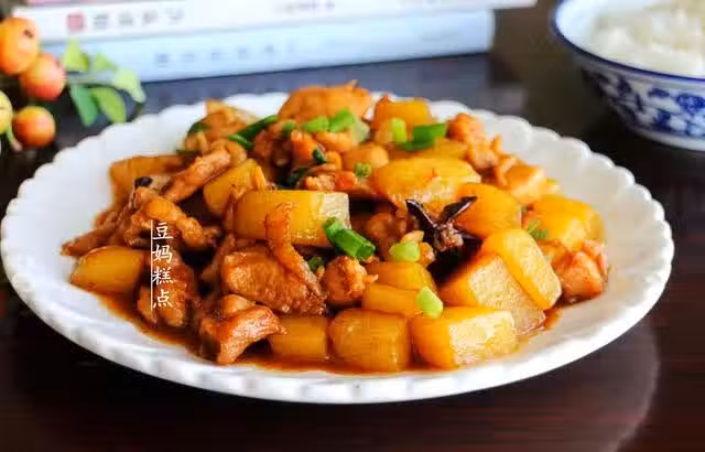 4、倒入土豆丁一起翻炒至雞丁完全變白,然後加入半鏟老抽翻炒上色。