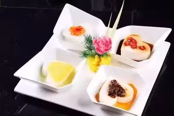 盒裝嫩豆腐1盒、紅泰椒汁(紅泰椒圈、美極鮮辣汁各5克,加入味精、香油各2克攪勻)、老乾媽牛肉醬(老乾媽牛肉醬12克用刀剁碎,加入東古一品鮮4克、香油2克攪勻)、泰國雞醬15克、橙汁10克