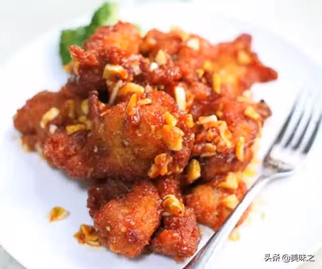 7、倒入炸好的雞腿肉,翻扮,使其充分與番茄醬混合。