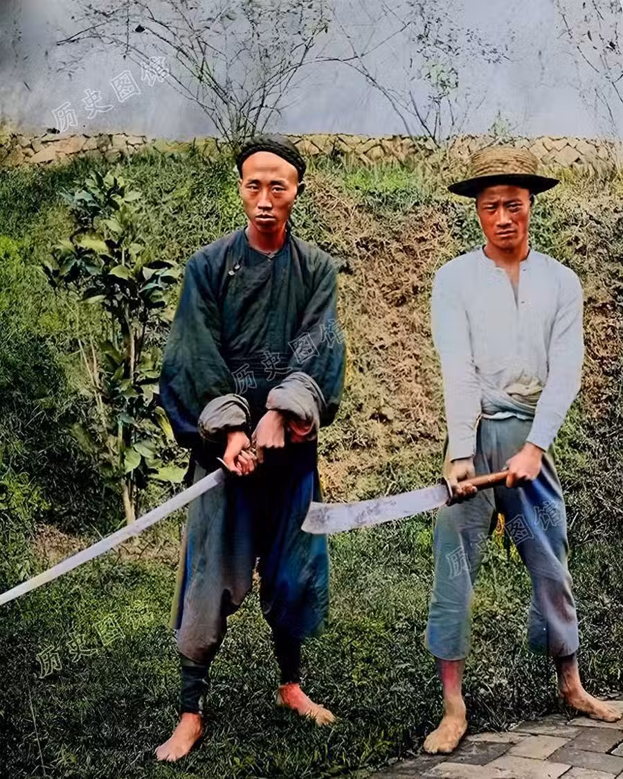 這是清朝時期的兩名職業劊子手,他光著腳站在路邊,正向人們展示他們的刀有多快。在當時,這是一個特殊職業,需要有超強的心理承受力。能當上劊子手的都不是一般人。
