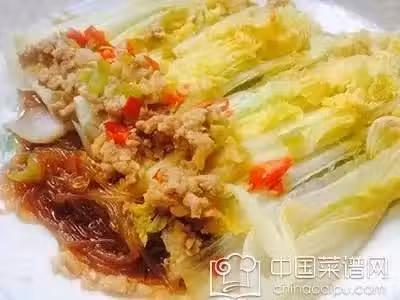 4、將蒸好的娃娃菜取出,將盤中菜汁倒入小碗中備用,將火腿絲鋪在娃娃菜上面。