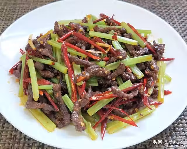 牛肉250克、芹菜150克、干辣椒20克、辣椒碎1勺、姜4片、蒜2瓣、鹽2克、雞精2克、生抽1勺、老抽半勺、辣椒油1勺。