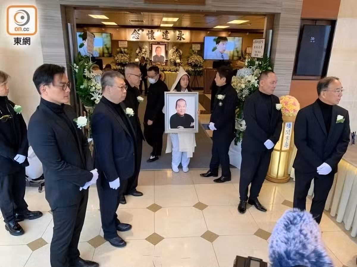 孟海出殯,錢嘉樂、楊明、盧惠光等為其扶靈,洪金寶拄拐杖送別
