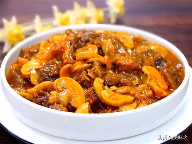 6、牛肉燉到軟而不爛之後,下蘑菇片煮30分鐘即可,請在出鍋前試鹹淡。