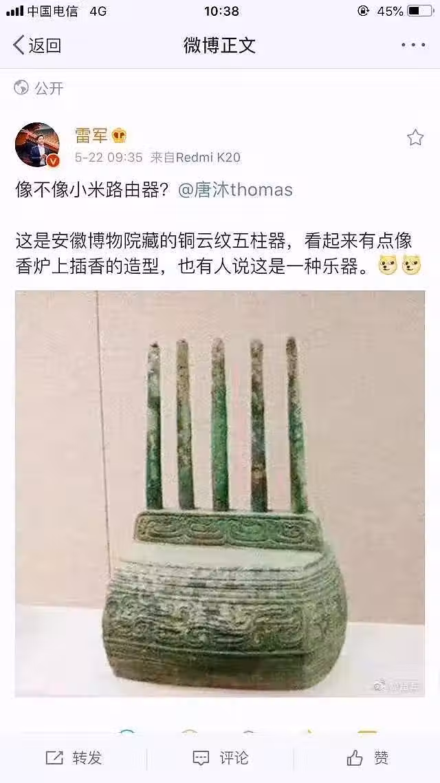 2019年,小米創始人雷軍在安徽博物院參觀,發現了此物,隨後曬出雲紋五柱器的圖片,配文字,"看起來像香爐上插香的造型,像不像小米路由器"?