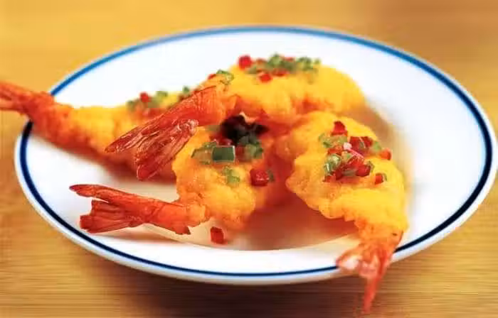 將蝦沾裹麵粉和蛋液時,一定要掛勻,煎炸時也要掌握好油溫及火候,油溫五六成熱,以斷生 為好。