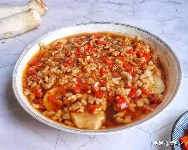 杏鮑菇2個、五花肉50克、大蒜3瓣、剁辣椒2勺、生薑5克。