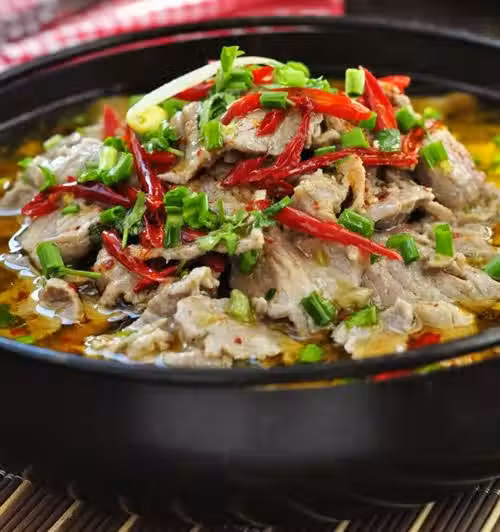 食材:牛裡脊500g、豆芽100g、粉條1把、干辣椒8個、姜1塊、蔥1段、八角1個、鹽2茶匙、胡椒粉1茶匙、蚝油1湯匙、蛋清1個、澱粉1湯匙、高湯2碗、辣椒粉1茶匙、花椒粉1/2茶匙、芝麻1茶匙