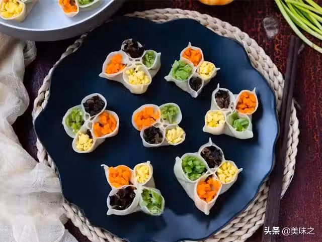 8、把四邊分開,分別裝入四樣材料,胡蘿蔔碎、扁芸豆碎、黑木耳碎、雞蛋碎,填好後就是圖中的樣子。