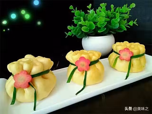 11、取出口袋包子,剪掉腰上的線。用燙軟的小蔥和焯熟的胡蘿蔔梅花裝飾。