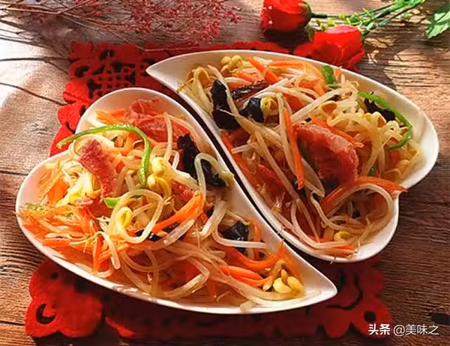 黃豆芽適量、綠豆芽適量、青椒適量、胡蘿蔔適量、臘腸適量、木耳適量、蔥適量、姜適量、鹽適量、雞精適量、生抽適量。
