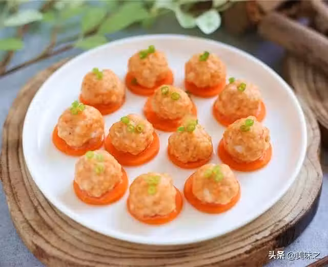 5、抓起一把蝦泥,用力一擠,蝦丸即可從虎口擠出,放在胡蘿蔔片上。