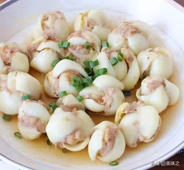6、再在百合上加適量肉餡,再扣上百合,做成一個大小合適的百合。