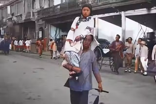 在清朝,從事這一行業的男子被稱為「桂奴」,坐在肩膀上的就是青樓女子。他正要送她去約定的地點。