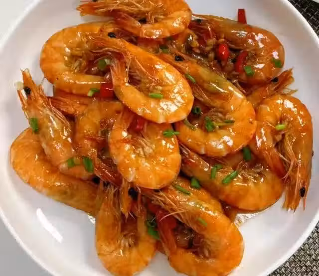 (5)再放入腌制好的大蝦,翻炒至兩面金黃色,倒入調好的料汁,加入一勺清水,蓋上鍋蓋,燜至蝦仁熟透入味,關火出鍋。