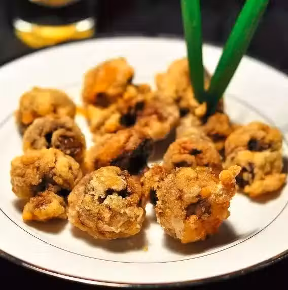 起鍋熱油,油稍多一些,七分熱一個個下入口蘑炸至金黃撈出。喜歡酥一點的可以復炸。